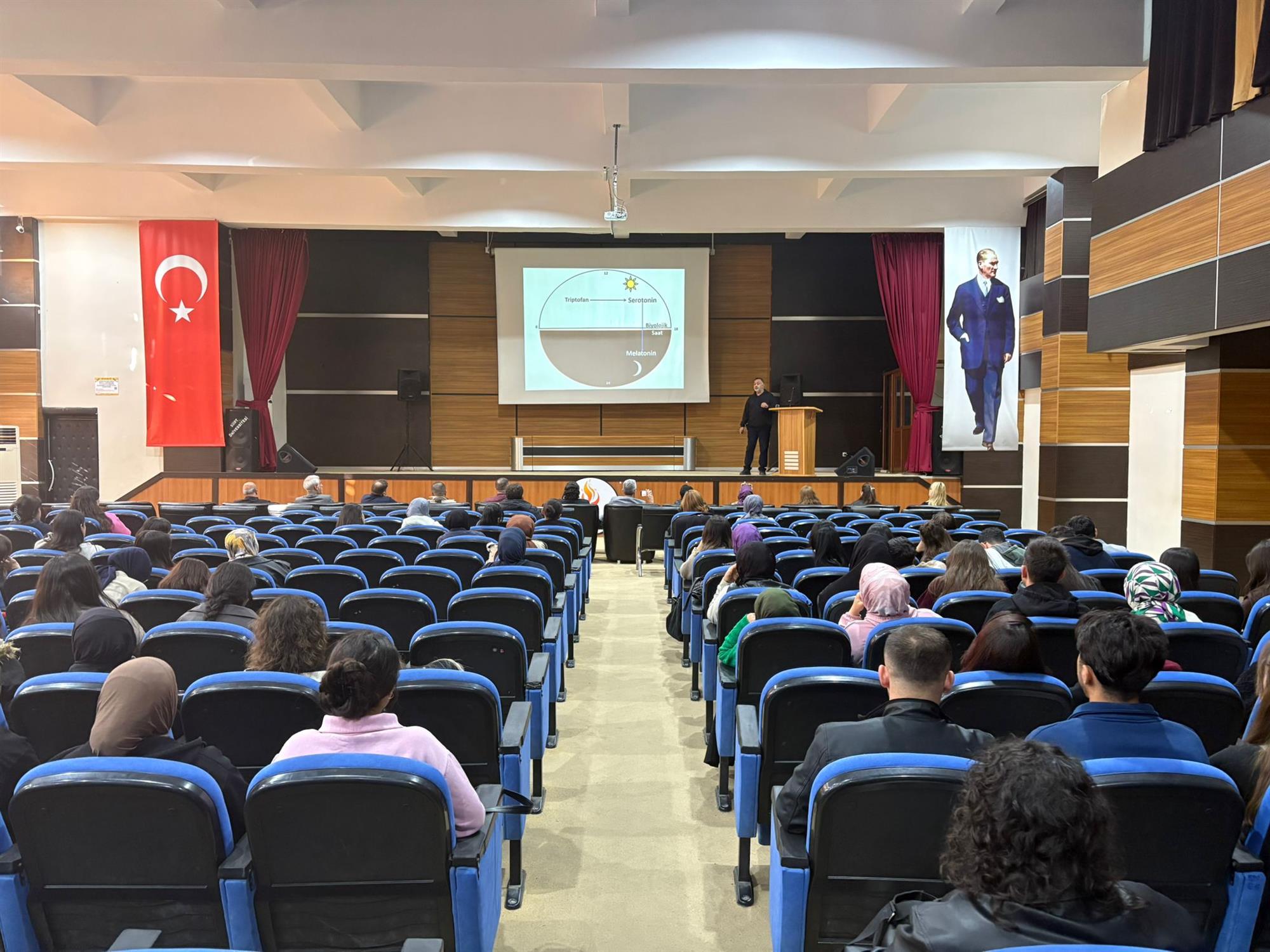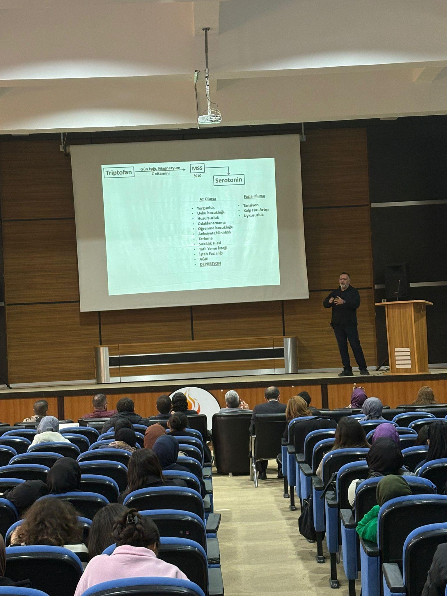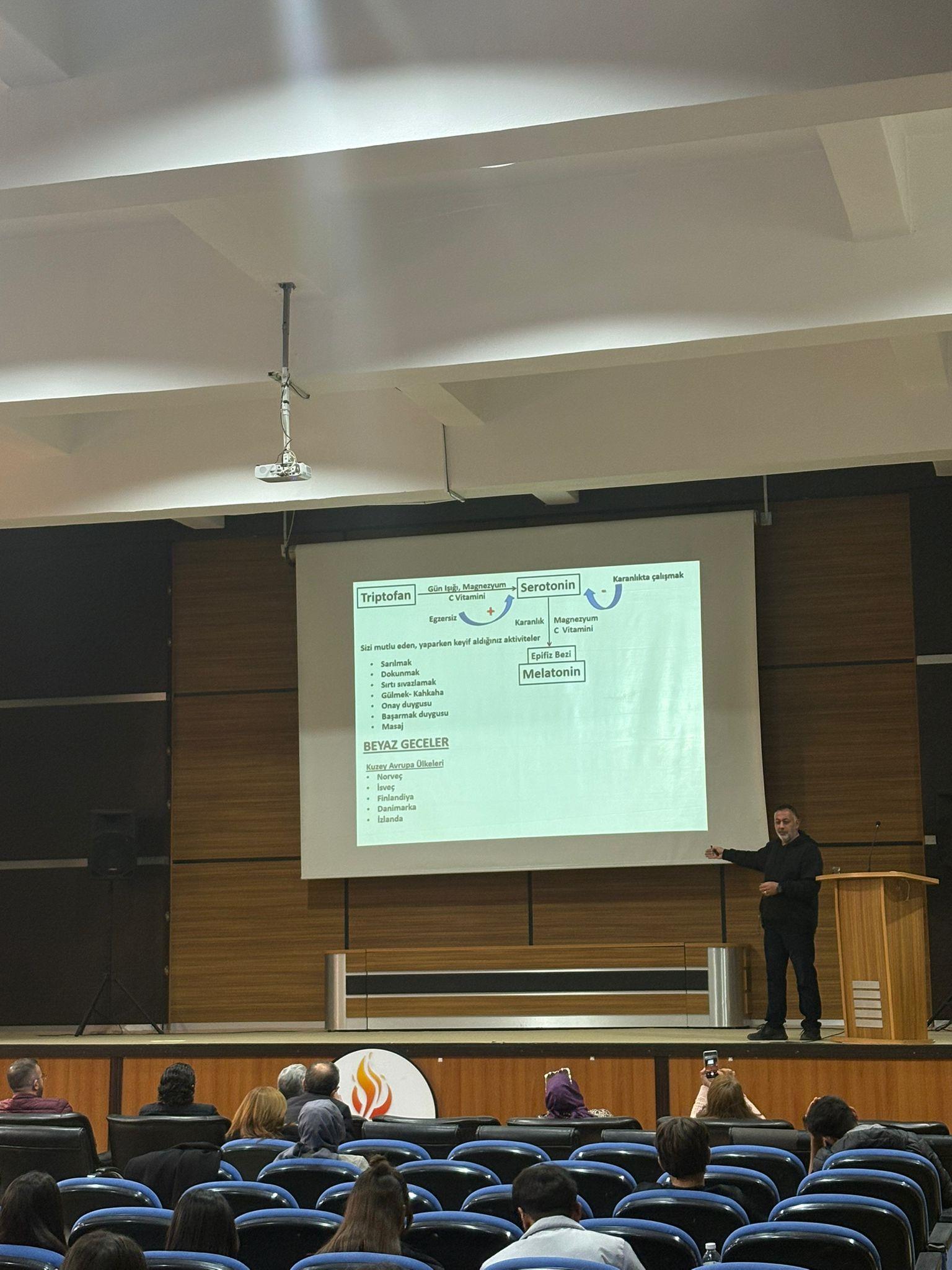 Yüksekokulumuz konferans salonumuzda Norö-Gelişim Seminerlerinin üçüncüsü olan""Gece Gündüz Demeden, Serotonin-Melatonin" konulu konferansımız gerçekleştirilmiştir. Yapılan konferansta Doç.Dr. Mehmet Üyüklü tarafından Serotonin ve Melatoninin vücudumuz üzerindeki etkisi anlatılmıştır.