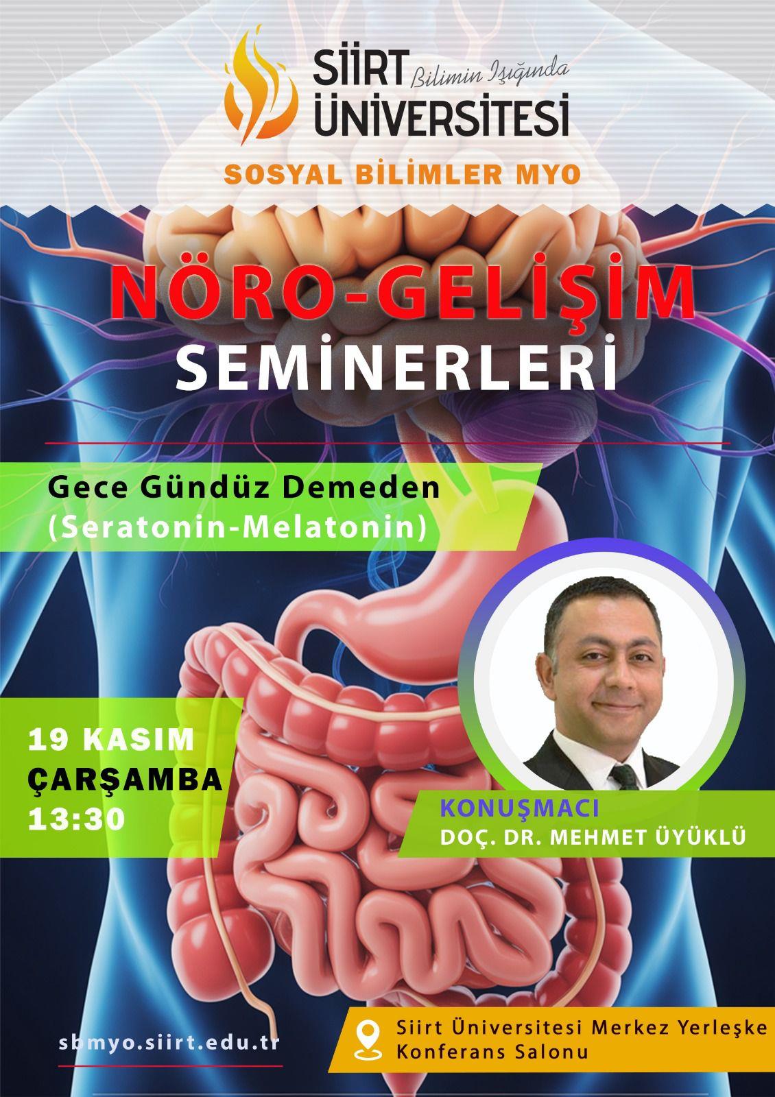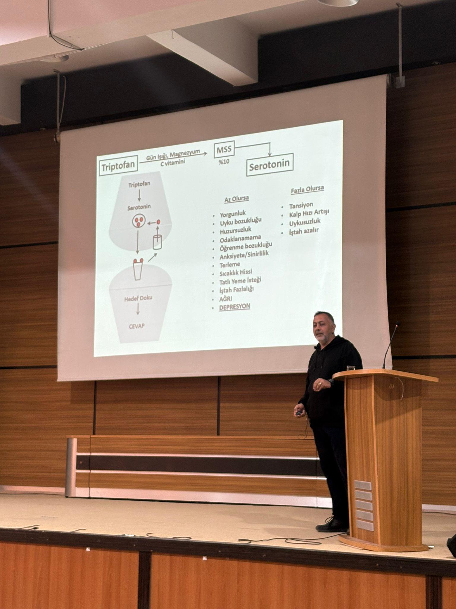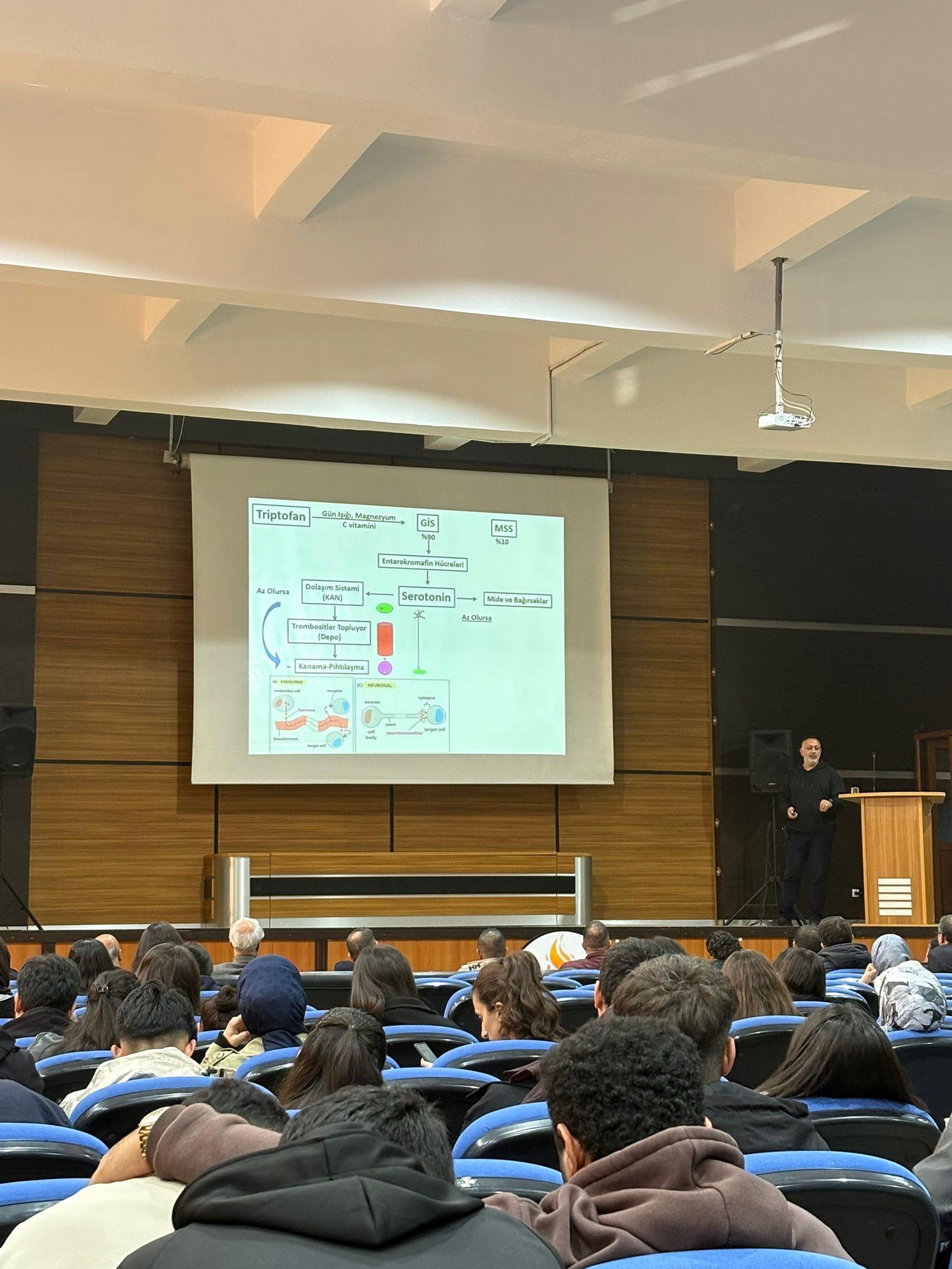 Yüksekokulumuz konferans salonumuzda Norö-Gelişim Seminerlerinin üçüncüsü olan""Gece Gündüz Demeden, Serotonin-Melatonin" konulu konferansımız gerçekleştirilmiştir. Yapılan konferansta Doç.Dr. Mehmet Üyüklü tarafından Serotonin ve Melatoninin vücudumuz üzerindeki etkisi anlatılmıştır.