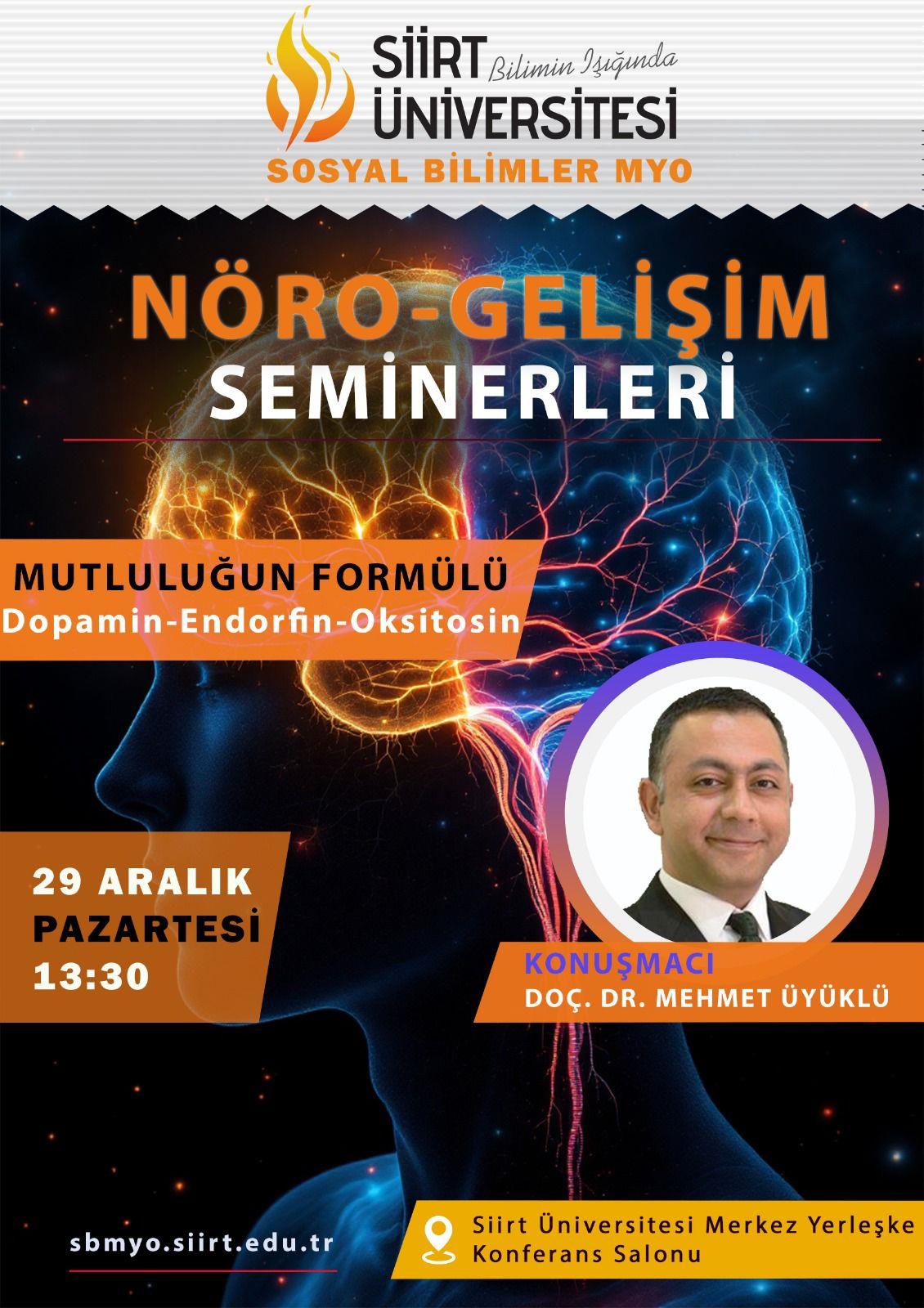 Doç. Dr. Mehmet Üyüklü tarafından "Norö-Gelişim Seminerleri" serisinin beşincisi düzenlenecektir. Beşinci seminer, "Mutluluğun Formülü-Dopamin, Endorfin, Oksitosin" konusuyla, 29 Aralık Pazartesi günü saat 13.30'da Yüksekokulumuz konferans salonunda düzenlenecektir. Tüm öğrencilerimiz ve personelimizin davetlidir.
