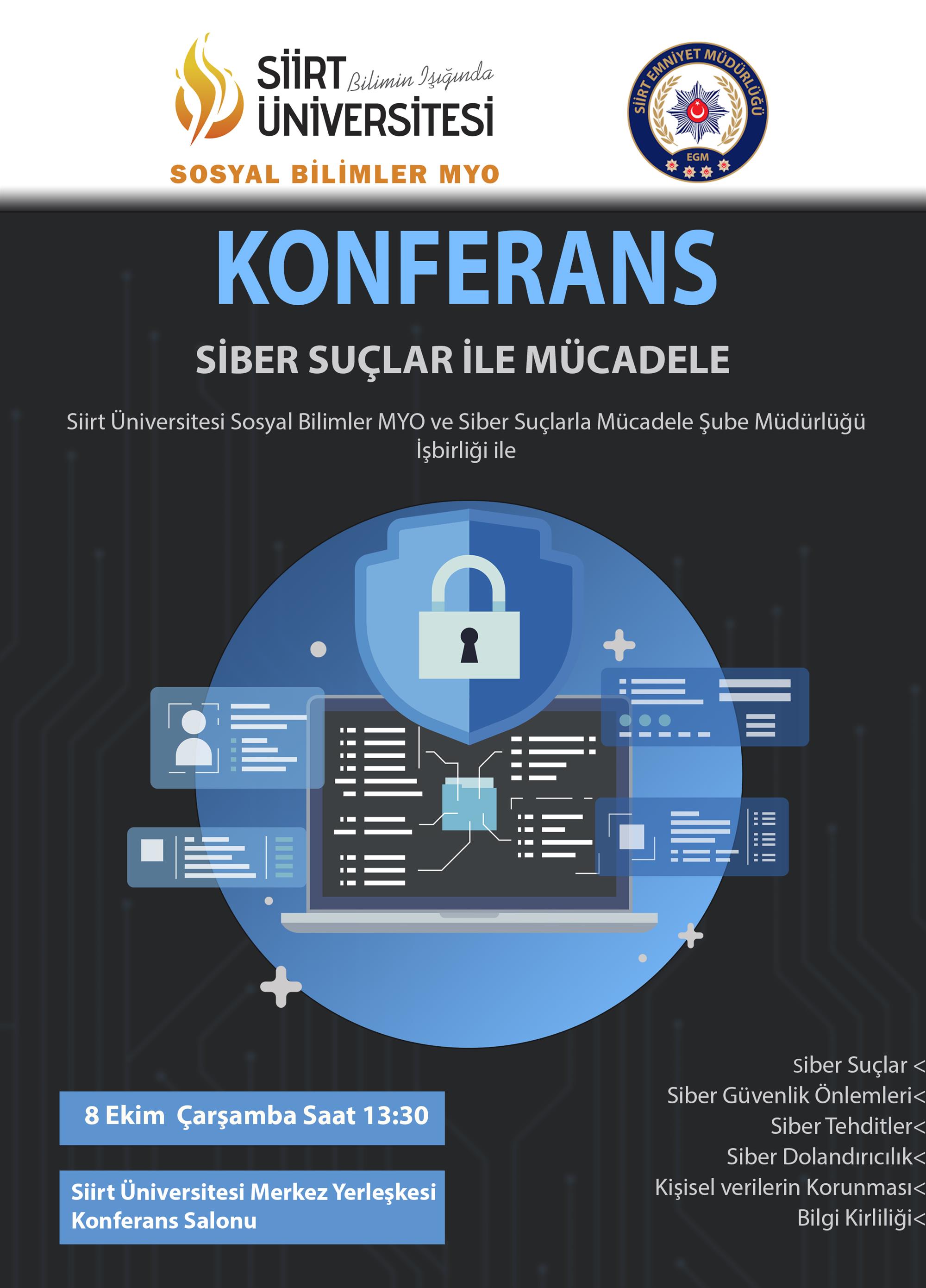 Bilişim sistemleri üzerinden gerçekleşen dolandırıcılık eylemleri hakkında bilinçlendirmek amacıyla, 8 Ekim Çarşamba günü saat 13:30’da Siirt Emniyet Müdürlüğü Siber Suçlarla Mücadele Şubesi tarafından konferans düzenlenecektir. Tüm öğrencilerimiz davetlidir.